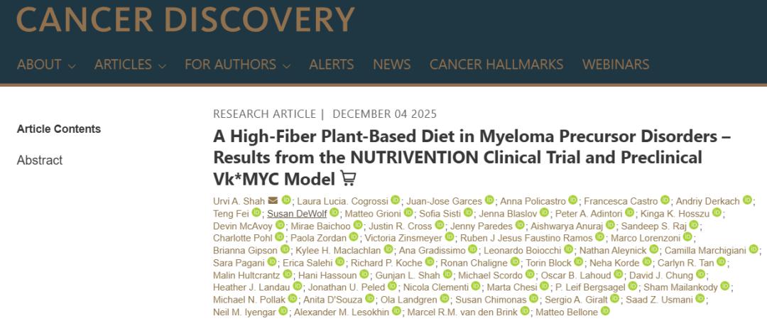 2025年12月,发表在《癌症发现》(Cancer Discovery)的一项研究显示,坚持吃富含纤维的植物性饮食,可以显著改善菌群、代谢和免疫,延缓骨髓瘤前体疾病进展,也就是阻止癌前病变发展成癌症。①